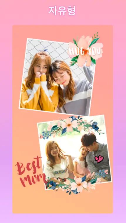 ◎ 자유형이라는게 있는데 그게 제가 원하던 콜라주에요 아주 편하게 이용이 가능합니다. 그냥 사진 추가해서 각도 다른게하고 크기도 바꿔가면서 하는데 정말 이쁘게나오기도하고 배경도 여러종류로 많아서 고르는게 힘들정도로 좋더라고요. 콜라주할때 꼭 써보세요
