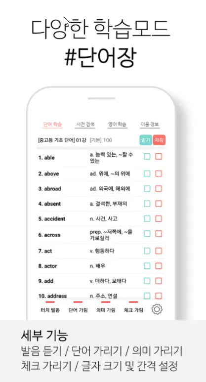 : 단어 가리기 / 의미 가리기 / 발음 청취 / 예문 보기 / 사전 검색 / 자동 재생