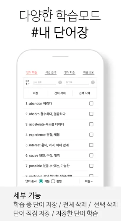 학습 중 단어 저장 / 전체 삭제 / 선택 삭제